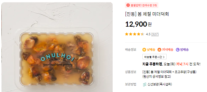 집이 강남권인데, 유투버님의 영상에 나온 가게는 마포구더라구요. 마포구 잘 나가지도 않아서... 강남권에서 찾아봤는데 딱히 해산물 전문점이고, 미더덕회를 취급하는 곳이 없더라구요. 그래서 갑자기 떠오른 오늘회! 여기서 찾아봤더니?! 역시나 있습니다. 해산물은 오늘회가 최고인 듯 합니다. 바로 주문! 가격은 12,900원!
